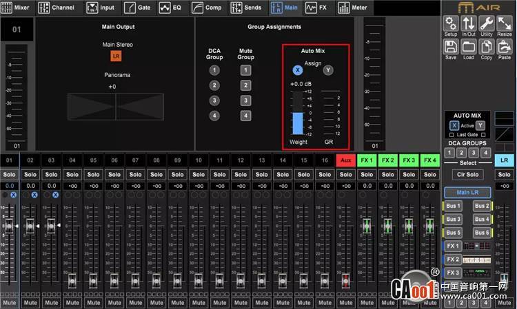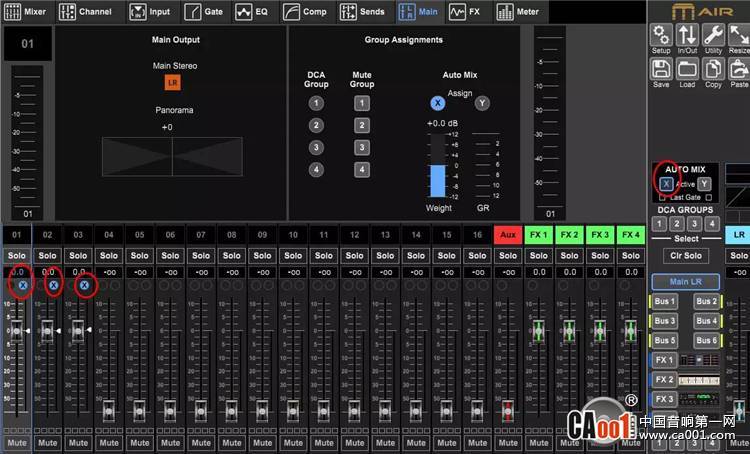 下面我给前三个通道编到X组,这里要注意的是,在给每个通道分完组之后,要记得把总的AUTO MIX的开关打开,如图红圈所示。